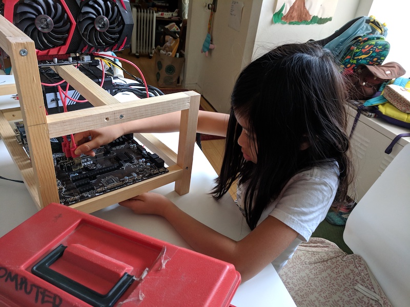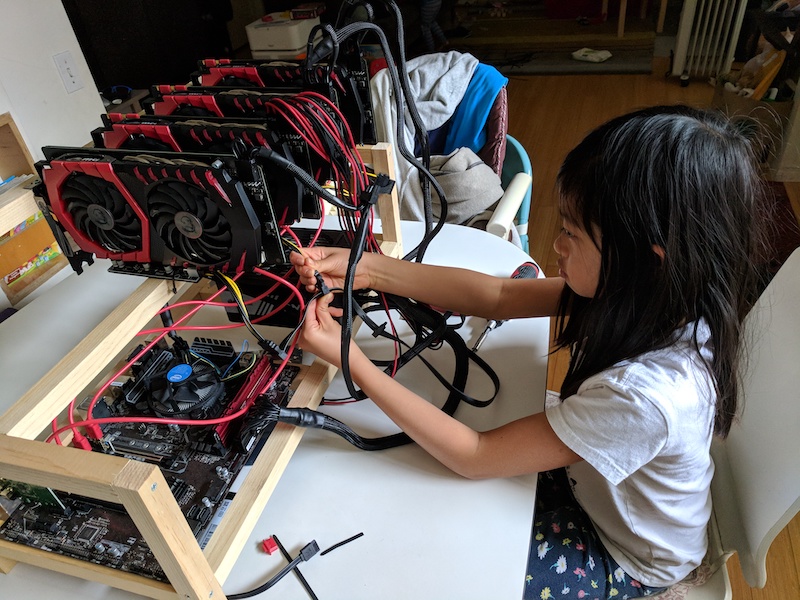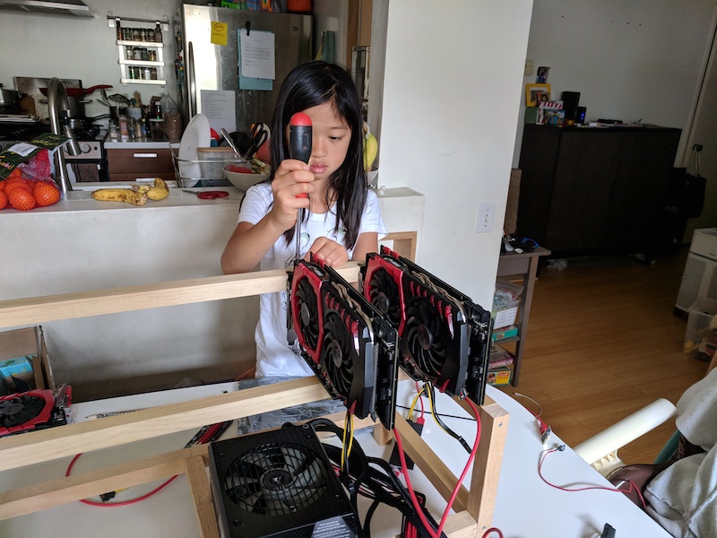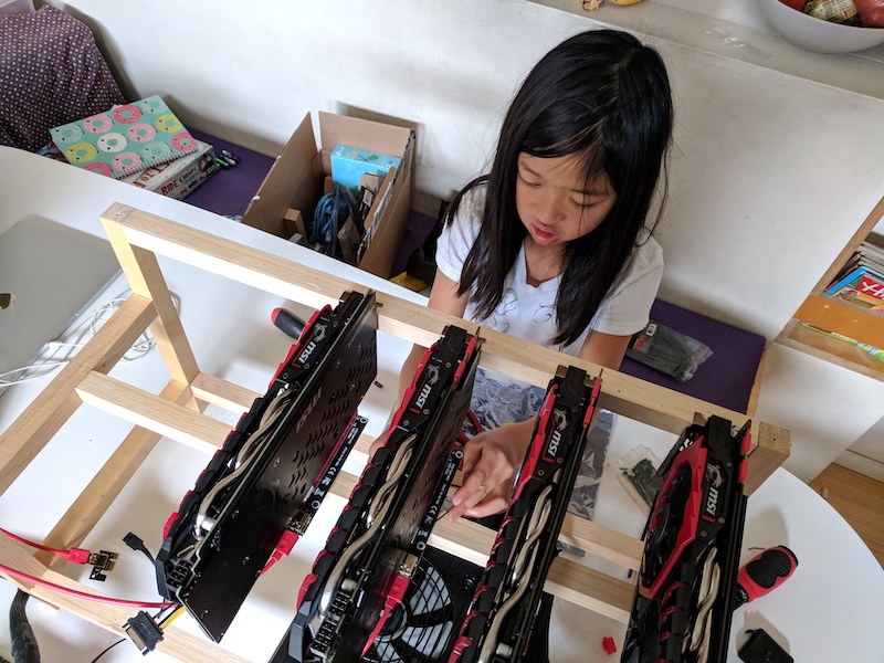 My daughter building her first computer—an Ethereum mining rig—with a little help from me.