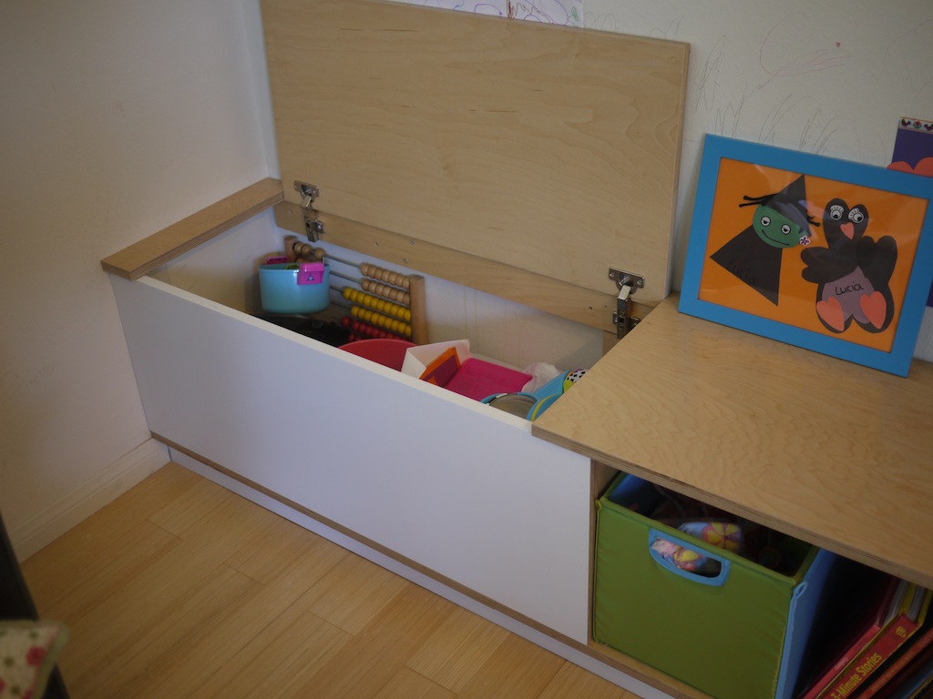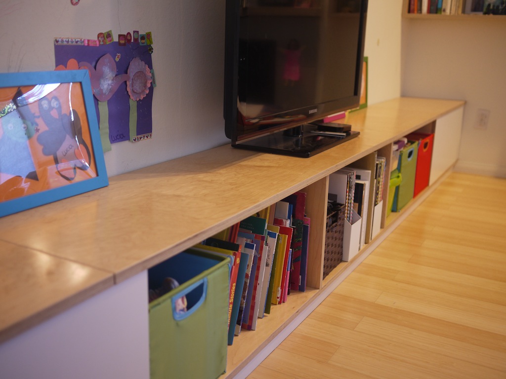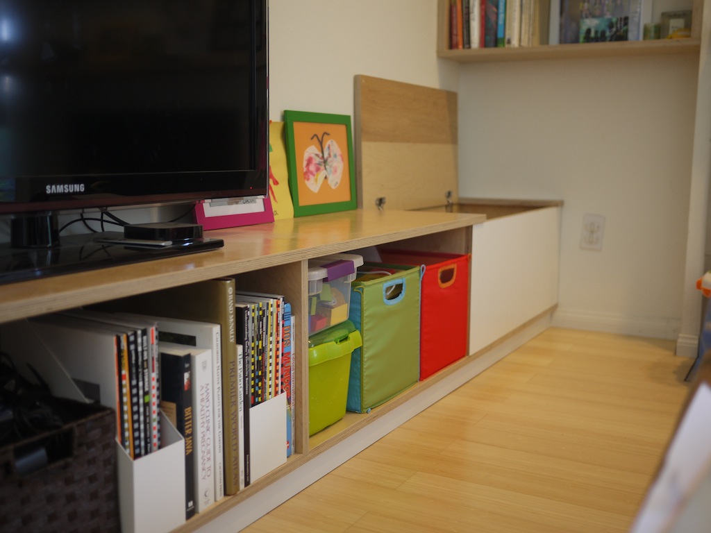 Built-in storage bins and cubbies that can function as bench.
