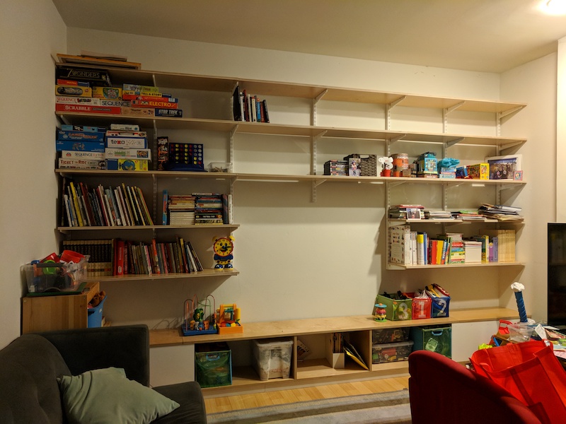 Custom wall shelving with Elfa brackets.